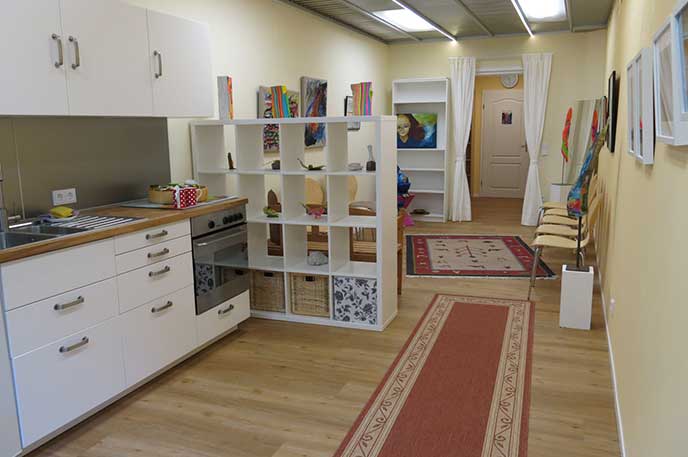 Seminarraum KrefeldUnsere größeren Veranstaltungen finden in unserem großzügigen, modernen Seminarraum in Krefeld, Weyerhofstraße 67, statt. Neben einem ca 80qm großen, hellen Teppichraum verfügt der Seminarraum Krefeld über eine kleine Küche, Umkleide, Garderobe und Toilettenräume. Unsere Räume liegen im Souterrain mit anschließendem Hanggarten und ist über eine Treppe oder einen Aufzug zu erreichen.